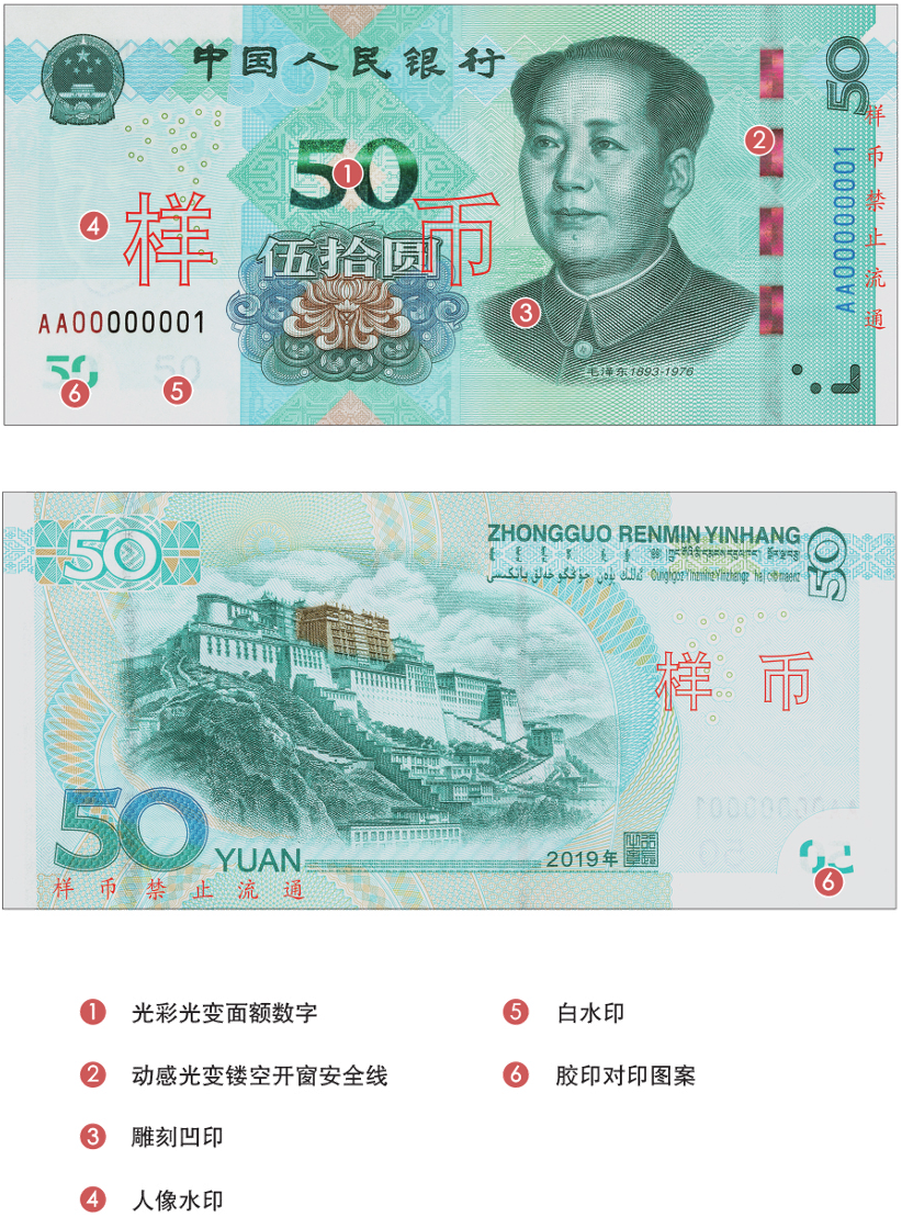 2019年版第五套人民幣50元紙幣規格、主圖案、主色調、“中國人民銀行”行名、國徽、盲文面額標記、漢語拼音行名、民族文字等要素,雕刻凹印、白水印等防偽特征,均與2005年版第五套人民幣50元紙幣相同。